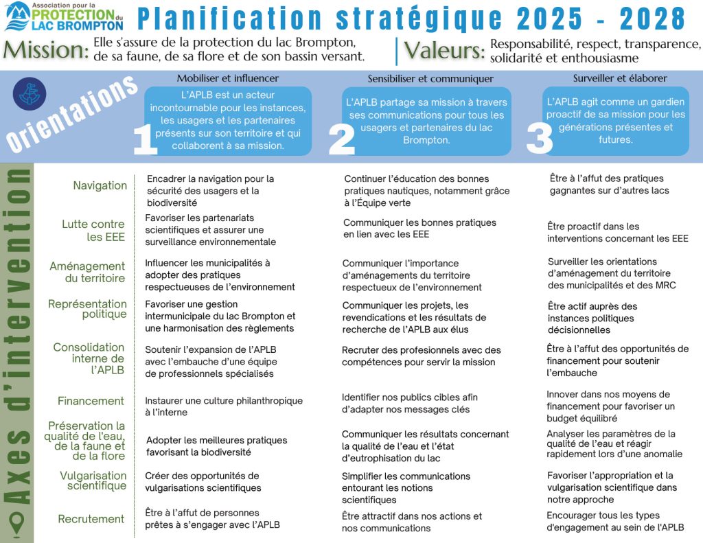 L’Association pour la protection du lac Brompton (APLB) a lancé une planification stratégique 2025-2028 suite à des changements organisationnels internes. Cette démarche vise à recentrer les administrateurs sur la mission de l’organisme et à mobiliser davantage les membres.